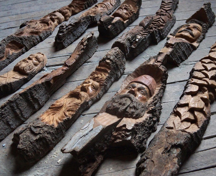 Lucas' works range from wood spirits to large scale human figurative and wildlife sculptures. The wood spirits are carved in Cottonwood bark, which Lucas sustainably harvests from the banks of the Red & Assiniboine rivers. Many of these wall hanging pieces are inspired by the pagan legends of the Green Man and the tree spirits. Larger figurative sculptures are first roughed in with a chainsaw, then slowly refined by hand with a mallet and chisel. Lucas' work strives to create more than just a physical representation, but to imbue the piece with a distinct sense of life, personality, and an internal subjective state.