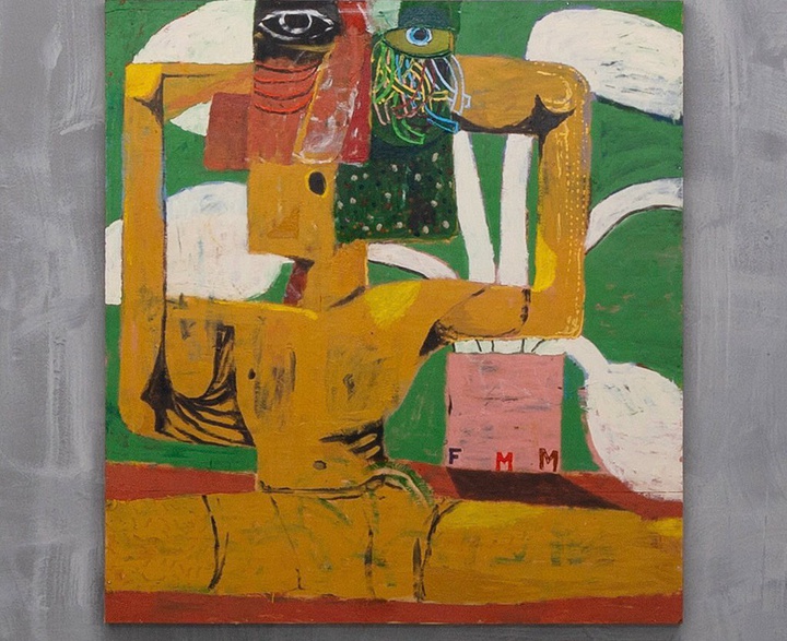 Francisco Mendes Moreira (1984) lives and works in Lisbon. The chromatic drawings and paintings of Portuguese artist Francisco Mendes Moreira often depict abstract faces and figures as he explores universal themes relating to the human experience. Typically engaging with repurposed surfaces ranging from old scraps of fabric and cardboard to blocks of wood, Moreira uses oil paint or oil pastel to create his complex portraits. The artist is also recognized for his renderings of sprawling landscapes featuring trees and mountains; these elements are usually depicted in unnatural hues and highlight the otherworldly feeling the work evokes. Work from Moreira’s extensive oeuvre has been exhibited throughout Europe and North America.