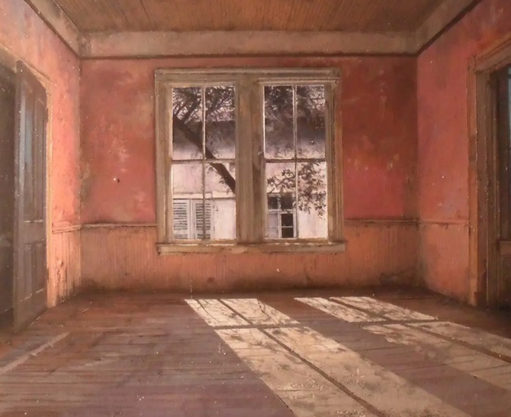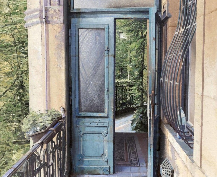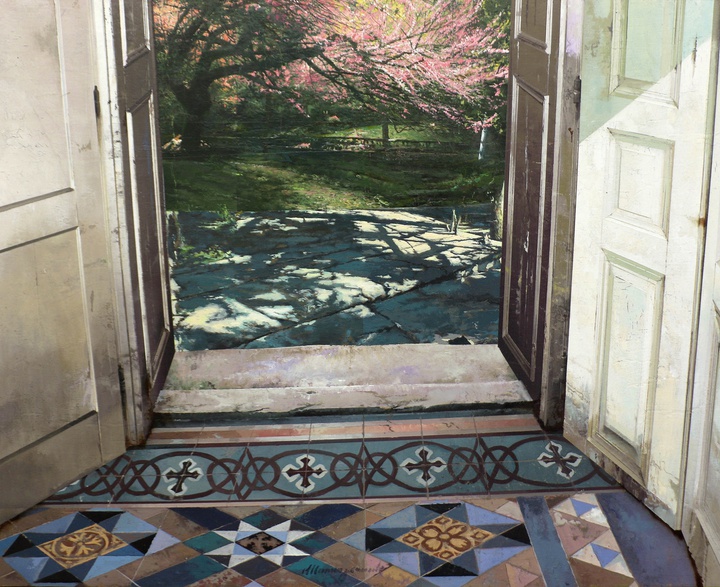 Matteo Massagrande was born in 1959 in Padua, Italy. He is highly influenced by 19th century Italian realism. Since 1973, he has exhibited his works in many public and private collections around the world. He lives and works in Padua, Italy and Hayoş, Hungary, and the influence of both places on his works is quite clear. His fascinating and mysterious paintings show the interior spaces of architecture with views to the exterior spaces, the interior spaces are uninhabited, decaying and possibly abandoned. Color and light in his works follow the Venetian tradition and with their quiet quality often without human subjects in the foreground along with lush and fertile backgrounds, they show a dialogue between the past and the present. There is a tension in these seemingly calm and controlled paintings. His works bring melancholic and optimistic feelings at the same time and show the past human presence in the frame and at the same time draw the viewer's eye to rich interior spaces.