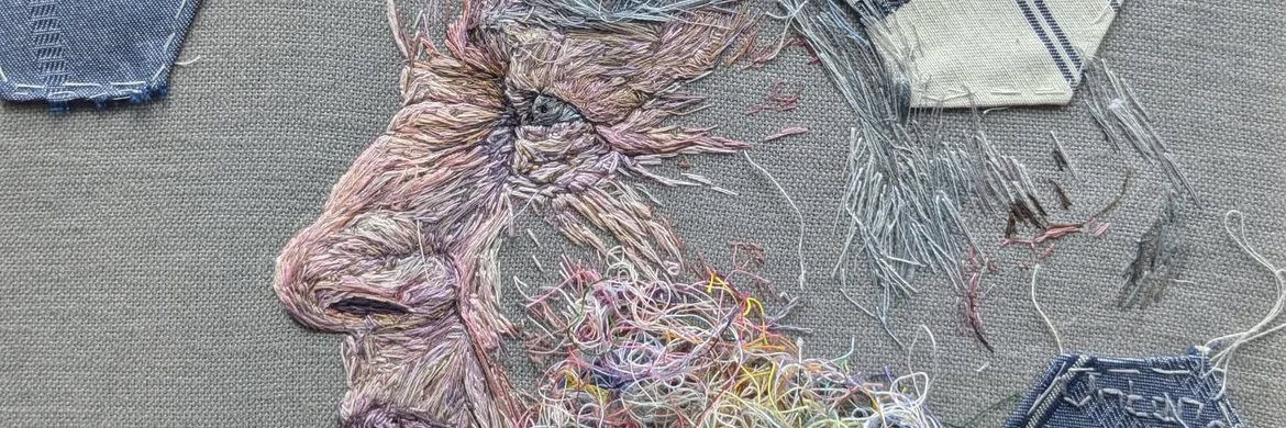 Emily has exhibited internationally, regularly in London, also across the UK in group and solo shows. Winning a Kent Creative Award for Visual Art (2017) she has also been a finalist in the Winter Pride Art Awards (2015), selected for the Royal Academy’s Summer Exhibition, Mall Galleries, Ruth Borchard Self Portrait Prize in addition to her appearance on Portrait Artist of the Year 2014. Emily is a thread painter, instead of using paint she hand stitches her subjects, giving more control over the tones and the details – she likens the technique to drawing with colouring pencils. Emily’s portraits are fragmented, inspired by relics and torn wallpaper, giving a broken up view of the sitter yet recognisable at the same time. With a sense of history – of a ripped away memory left behind alongside a contemporary take on a traditional technique. The creating process has a nod to the make do and mend, as if with every stitch the self is being repaired (of the model and artist).