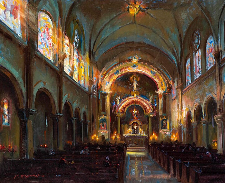 Born 1965 in Kewaskum, Wisconsin, where he now lives with his wife Jennifer, and their young children, Dan's interest in art emerged as a teenager. Studies at the American Academy of Art in Chicago, Illinois and his voracious appetite for museums and the modern masters such as John Singer Sargent, Alphonse Mucha, Nicolai Fechin, Joaquin Sorolla, Carl von Marr as well as a host of other French and American impressionists have inspired him. Dan has a particular interest and appreciation for modern Russian art and the sumptuous canvases of the painters Nicolai Fechin, Isaac Levitan and Ilya Repin. As Dan says, their paintings are "completely loose yet deliberate and faithful, not at all flashy." Indeed, the powerful and evocative beauty of Gerhartz's paintings are also due in large measure to looseness, honesty and faithfulness of his style. Dan's paintings embrace a range of subjects, most prominently the female figure in either a pastoral setting or an intimate interior. He is at his best with subjects from everyday life, genre subjects, sacred-idyllic landscapes or figures in quiet repose, meditation or contemplative isolation. His mastery of the female figure, the clothed figure especially, is brilliant. He has drawn inspiration from the very old tradition of romanticism and symbolism. His absolutely lavish surfaces, color and lighting are in harmony with his expressionistic brushstroke, application and modeling of light and shade. His paintings are sensitive yet evocative creations, which dramatize his bold and ambitious technique. He is at his very best when he allows himself to explore the surface in a free and painterly manner, while retaining his sense of other worldliness. His subjects evoke a timelessness and idealism, yet for the most part Dan has drawn upon his home and community in Wisconsin, including family and friends. His sense of intimacy and honesty with regard to his subjects are a direct result of his closeness and proximity to them. A projection of tranquillity, repose and rich introspection result from his knowledge of the content of his art. In Gerhartz's pictures the ordinary or commonplace is transformed into a higher reality and consequently a sense of greater importance. Emotions are a vital part of his express design, while his mastery of anatomy, the human form and complex surfaces combine to make his canvases very powerful visual experiences. About his work Dan has said, "My desire as an artist is that the images I paint would point to the Creator, and not to me, the conveyor. J.S. Bach said it well as he signed his work, 'Soli Deo Gloria,' To God alone be the glory."