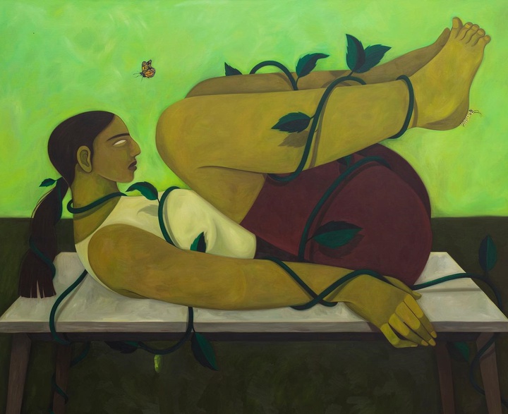 Hilda Palafox (Mexico, 1982). Her work includes painting, drawing, ceramics, and textiles. Hidden in her strokes, the mystery of the feminine is balanced with the symbolism of the physical, emotional, and spiritual state; she explores the body as matter with the ability to mold itself. Her use of the figurative focuses on the female figure as a tool of expression. The line, as a continuous succession of points, becomes important in Palafox's work, in which it is possible to observe the intersection of disciplines. The movement of the brush in both curved and straight lines traces the body mass of her characters that cover large parts of the canvas, made up of colorful and textured planes due to the materiality of the oil. Her training in graphic design has led her to focus her interest on the color and syntax of the image, as well as on the connection with the viewer through images that show daily activities turned into subtle analogies about emotions and the closest experiences of the human psyche. Hilda Palafox lives and works in Mexico City. She studied at the Design School of the National Institute of Fine Arts (EDINBA). She has participated in exhibitions in cities such as Oaxaca, Querétaro, MexicoCity, Miami, Los Angeles, San Francisco and Onomichi and has made murals in Mexico, the United States, Canada, Japan, and Brazil.