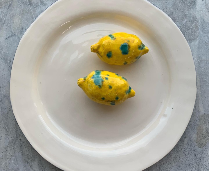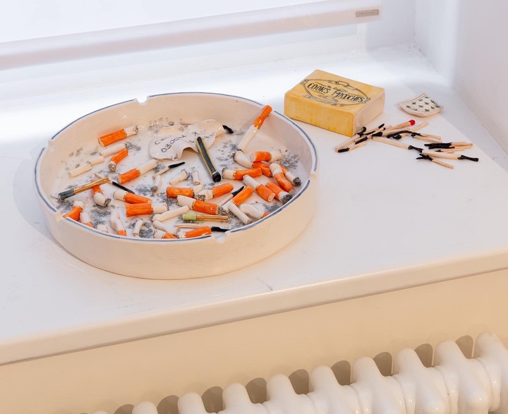 Often inspired by intimate day-to-day experiences from her formative years, Alma Berrow’s (b. 1992, United Kingdom) nostalgic and sometimes uncanny artistic vocabulary is inextricably linked to personal memory. Her practice re-investigates the genre of still life through portrayal of contemporary taboos and zeit-geist revelaed by the ubiquitious pocket litter left behind. Berrow succeeds in her ability to transform ordinary objects into art pieces that are both humorous and other-worldly beautiful. Berrow lives and works in London, previously attending Falmouth University for Art and Textiles. It was over her first lockdown, due to Covid-19, that she began to explore ceramics as her primary medium. Since then, Berrow has participated in a number of solo and group shows, including Philip's exhibition Seeing Red (2024) and her most recent solo show at Lamb Gallery, Echo (2023). In 2021, Berrow was part of Sotheby’s (Women) Artists auction, with her work presented alongside works by Lavinia Fontana, Dorothea Tanning, Cindy Sherman and Helen Frankenthaler.