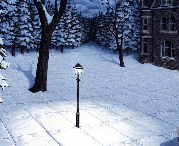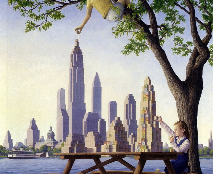 Rob Gonsalves made paintings that spoke to the joyful and wonderous imagination of children and to us adults who can still find that inner child willing to swing so high that our shoes touch the sky. Born in Toronto, Rob Gonsalves graduated from the Architecture program at Ryerson University and worked in the field for a few years before embarking on internationally acclaimed painting career. His architectural studies gave him the skill sets to manipulate points of view, perspective and scale in 2-D and enabled him to bend and play with reality. His influences include Magritte, Remedios Varo, Kurerlek and the ProgRock album covers of his teens. Rob Gonsalves drew from his own personal narrative. He was inspired by Toronto and New York architecture, the night sky and the rugged, Eastern Ontario landscape of rock, trees and lakes where he eventually settled in 2001.