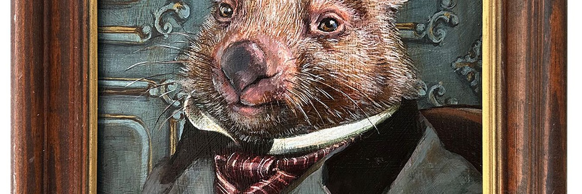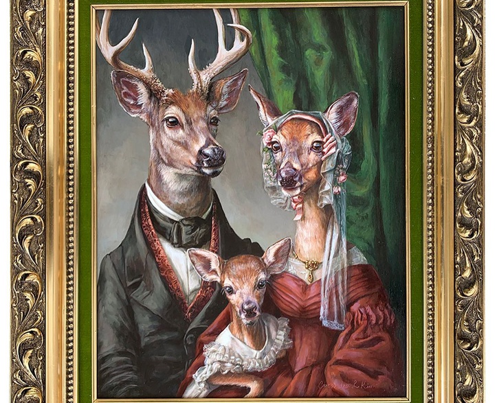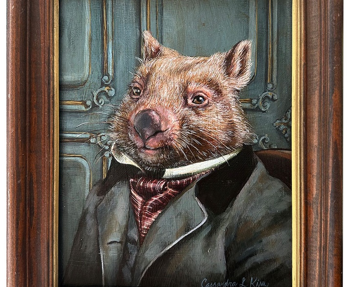 Cassandra Kim is a contemporary artist whose paintings explore the unique personalities and characteristics of animals and reflect a lifelong love traditional art. Inspired by the master painters of the past, she seeks to put her own slightly absurd surreal twist on art by replacing animals with people. Pairing an unexpected animal with an image from past societies creates a visual paradox that inadvertently humanizes the portraiture and often makes people smile. The use of humor is a valuable way to break down barriers between people and art. She works in the combination of acrylic and then oil on board, and restores reclaimed antique and vintage wood frames she finds for her work. Each piece is carefully crafted to capture the essence of the animal, and to highlight their individual traits and quirks. Her hope is that her work will inspire others to see animals in a new light. While appreciating the beauty and diversity of the animal kingdom through her imagined society; she reminds the viewers of the deep connection we experience and all share.