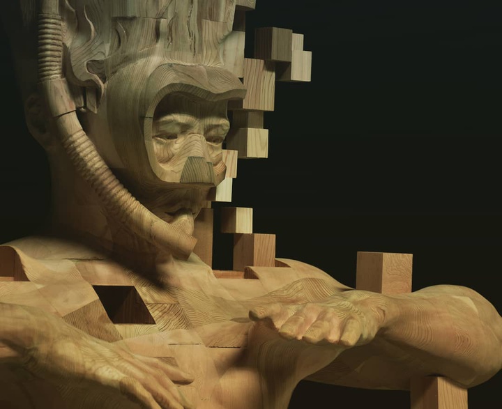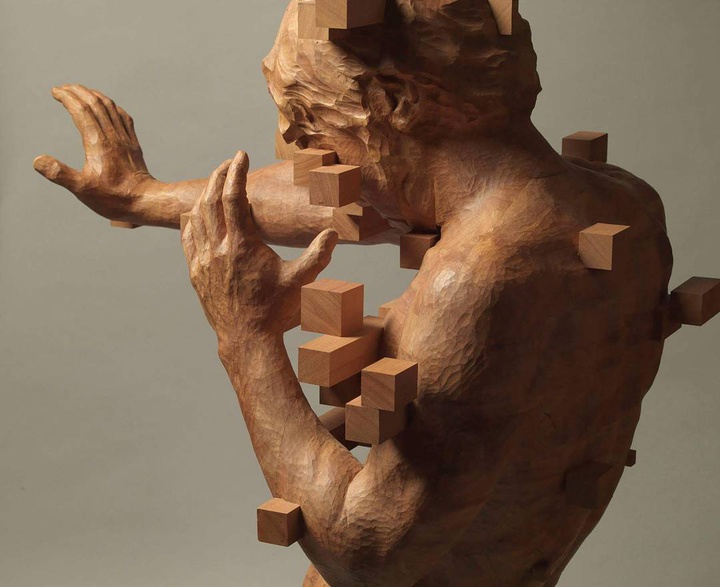 Digital and analog realms collide in the dynamic sculptures of Taiwanese artist Han Hsu-Tung (previously). Using soft western redcedar or Laotian fir, Han carves wooden animals and figures that are w…