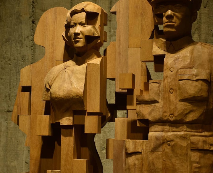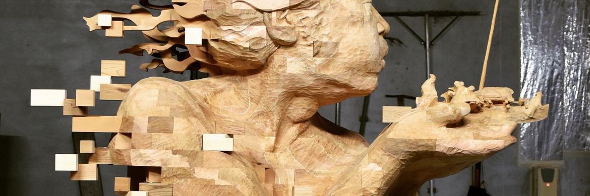 Digital and analog realms collide in the dynamic sculptures of Taiwanese artist Han Hsu-Tung (previously). Using soft western redcedar or Laotian fir, Han carves wooden animals and figures that are whisked into pixels, which appear to dissolve and float away from the central form. One of his most recent works, the stately warrior-like “Shaolin,” also features a kinetic component that shifts the blocks in jarring, horizontal movements. Taking approximately three to four months to complete, each work blends a computerized vision with the traditional medium as it draws attention to the scattered nature of the virtual world and how individual elements are essential to the whole.