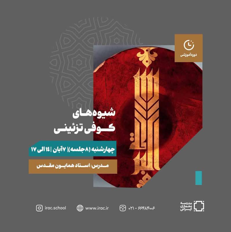 به گزارش روابط عمومی مرکز هنرهای تجسمی حوزه هنری، مدرسه معماری ایرانی، دوره آموزش شیوههای کوفی تزئینی را با تدریس استاد همایون مقدس برگزار میکند.