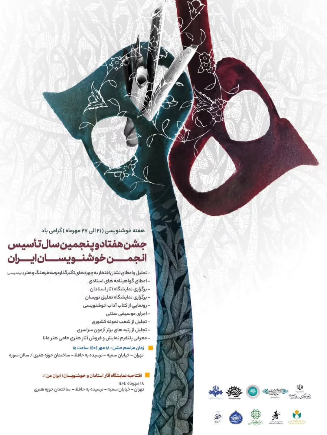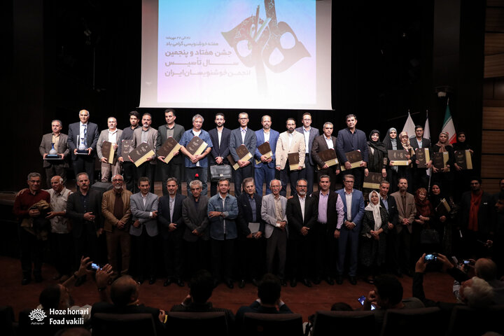 به گزارش روابط عمومی مرکز هنرهای تجسمی حوزه هنری، روز جمعه ۱۸ مهرماه در سالن سوره حوزه هنری، آیین بزرگداشت و جشن هفتاد و پنجمین سال تأسیس انجمن خوشنویسان ایران با همکاری مرکز هنرهای تجسمی حوزه هنری و انجمن خوشنویسان ایران برگزار شد. این مراسم با حضور جمعی از هنرمندان، استادان، مدیران فرهنگی و مسئولان شهری همراه بود.