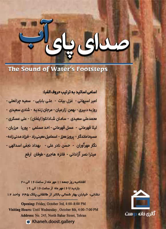 به گزارش روابط عمومی مرکز هنرهای تجسمی حوزه هنری، گالری خانه دوست به مناسبت بزرگداشت زادروز سهراب سپهری شاعرِنقاش یا نقاشِ شاعر در سالگرد تأسیس خود روز جمعه یازدهم مهرماه ، میزبان نمایشگاه گروهی با عنوان «صدای پای آب» است. در این نمایشگاه که با حضور جمعی از اساتید دانشگاه و هنرمندان برجسته برگزار میگردد آثاری به نمایش در خواهد آمد ، که در گفتوگویی میان هنر معاصر و اندیشههای ناب سهراب سپهری شکل گرفتهاند.