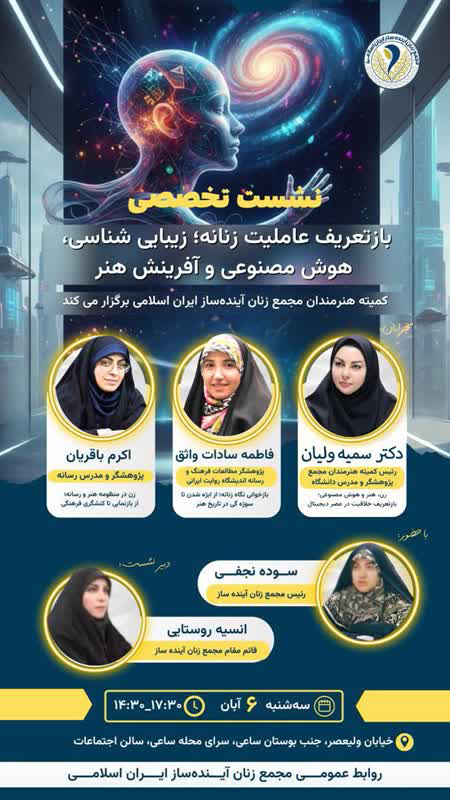 به گزارش روابط عمومی مرکز هنرهای تجسمی حوزه هنری؛ نشست تخصصی «بازتعریف عاملیت زنانه؛ زیباییشناسی، هوش مصنوعی و آفرینش هنر» روز سهشنبه ۶ آبان ماه با استقبال چشمگیر علاقهمندان به حوزه هنر و مطالعات زنان در سالن همایشهای سرای محله ساعی برگزار شد.
