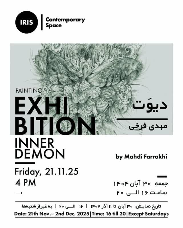 به گزارش روابط عمومی مرکز هنرهای تجسمی حوزه هنری، نمایشگاه نقاشی های مهدی فرخی با عنوانِ دیوَت ۳۰ آبان ۱۴۰۴ در فضای معاصر آیریس گشایش یافت.